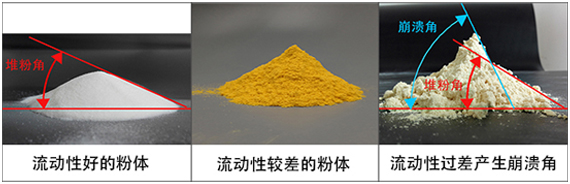 當粉體堆粉角較大,粉體的流動性開始變差,當粉體堆積產生崩潰角時,說明粉體流動性過差。含有崩潰角的粉體在混合工藝中不易均勻混合。