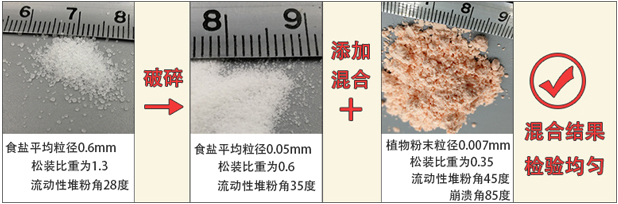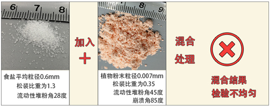 通過上圖中的實驗表明,先將不符合混合條件的食鹽進行破碎處理,使其粒徑下降91%,松裝比重下降52%,流動性也下降了,然后再將食鹽與植物粉末混合就能得到均勻合格的混合結果。