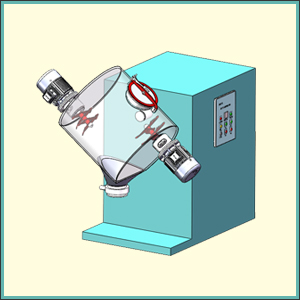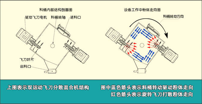 其混合原理是:料桶運動做重力擴散型混合疊加飛刀運動打散粉體混合。