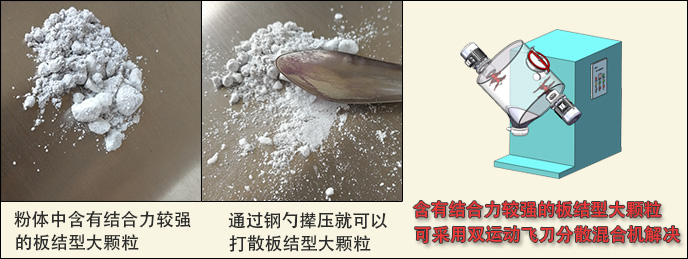 在實(shí)際的粉體混合工藝中常常會(huì)遇到粉體中含有各種各樣的團(tuán)粒結(jié)構(gòu)也稱假顆粒,其形成原因是粘性粘連、吸附、板結(jié)等形成的假形大顆粒組織(簡稱假顆粒)。還有些大顆粒是由團(tuán)狀纖維組織構(gòu)成的。