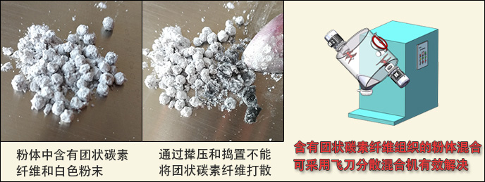 上圖中表示白色粉末與黑色團(tuán)狀碳素纖維之間的混合。碳素纖維纏繞緊密,通過攆壓、搗置也不易打開打散,但通過每分鐘1000轉(zhuǎn)的高速旋轉(zhuǎn)飛刀可將黑色的團(tuán)狀碳素纖維打開,最終達(dá)到了均勻混合的目的。