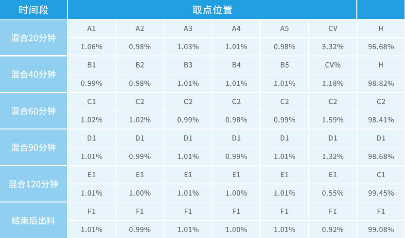 結論:設備混合 90 分鐘后 CV 可滿足要求。發現混合到 40~60 分鐘時均勻度有回落現象; 90 分鐘后混合均勻度叫穩定提高。