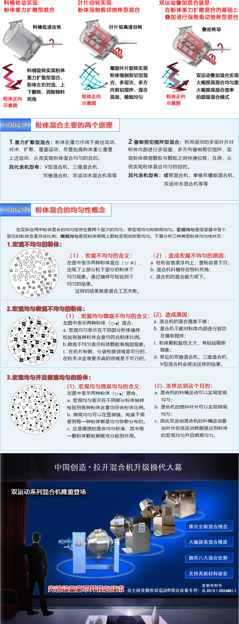 采用先進的雙運動疊加混合技術,在一臺設備上實現重力擴散型混合和強制剪切型混合兩大功能。既能做到宏觀大處均勻—即讓粉體上下翻滾、左右對流進行擴散均勻混合;又能對粉體微觀處顆粒與顆粒之間,反復進行多層次多方向地穿插、剪切,做到精細化強制混合。所以混合均勻度可以達到宏觀均勻和微觀超精細均勻的理想境界。