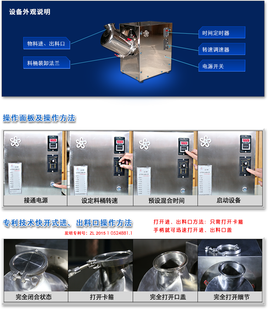 需要說明的是臺式實驗機的料桶容積有2升~15升之間,由于用于實驗目的的混合粉體批量較少,粉體之間的粉壓較低,其混合運動的強度也較低,因此臺式實驗機的混合效率略低于100升以上的中型混合機。適當延長混合時間也能達到很好的混合效果。