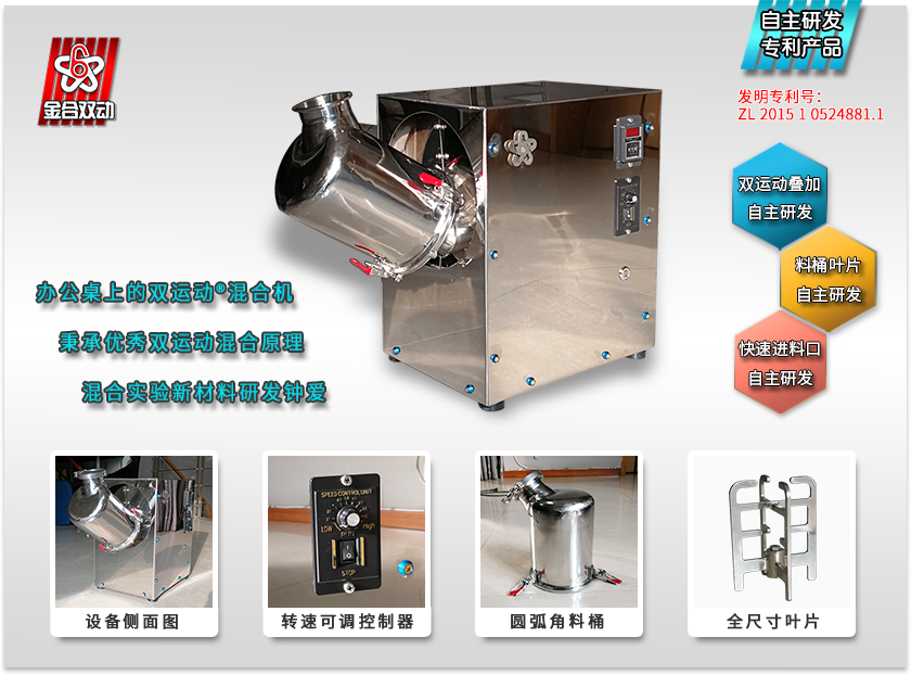 隨著中國制造2025的到來,各種新材料研發雨后春筍,目前市場很難找到小型、性能優異的臺式混合機??上驳氖请p運動臺式實驗機應運而生。其研發目的是秉承雙運動混合的先進混合原理同時又小巧精致可以放在辦公桌上運行。