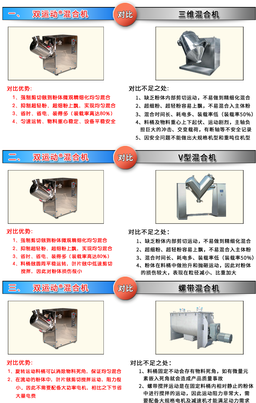 這也是因為兩個運動疊加混合的先進原理,在單位時間內兩個運動同時進行,不但雙倍地提高混合效率,還恰到好處地互相促進混合作用,促進混合工作更加有效地進行。因此雙運動混合機比傳統混合機節省時間60%。