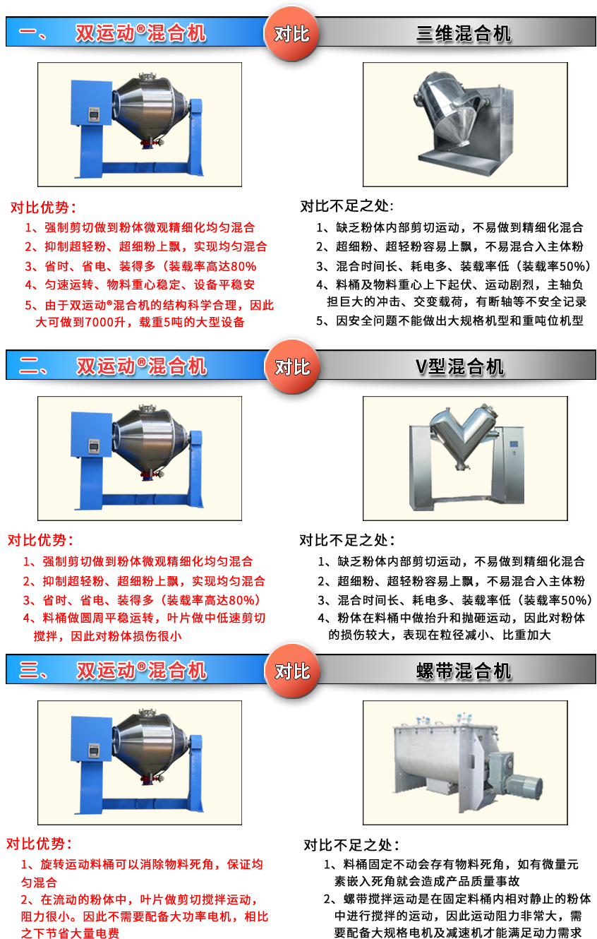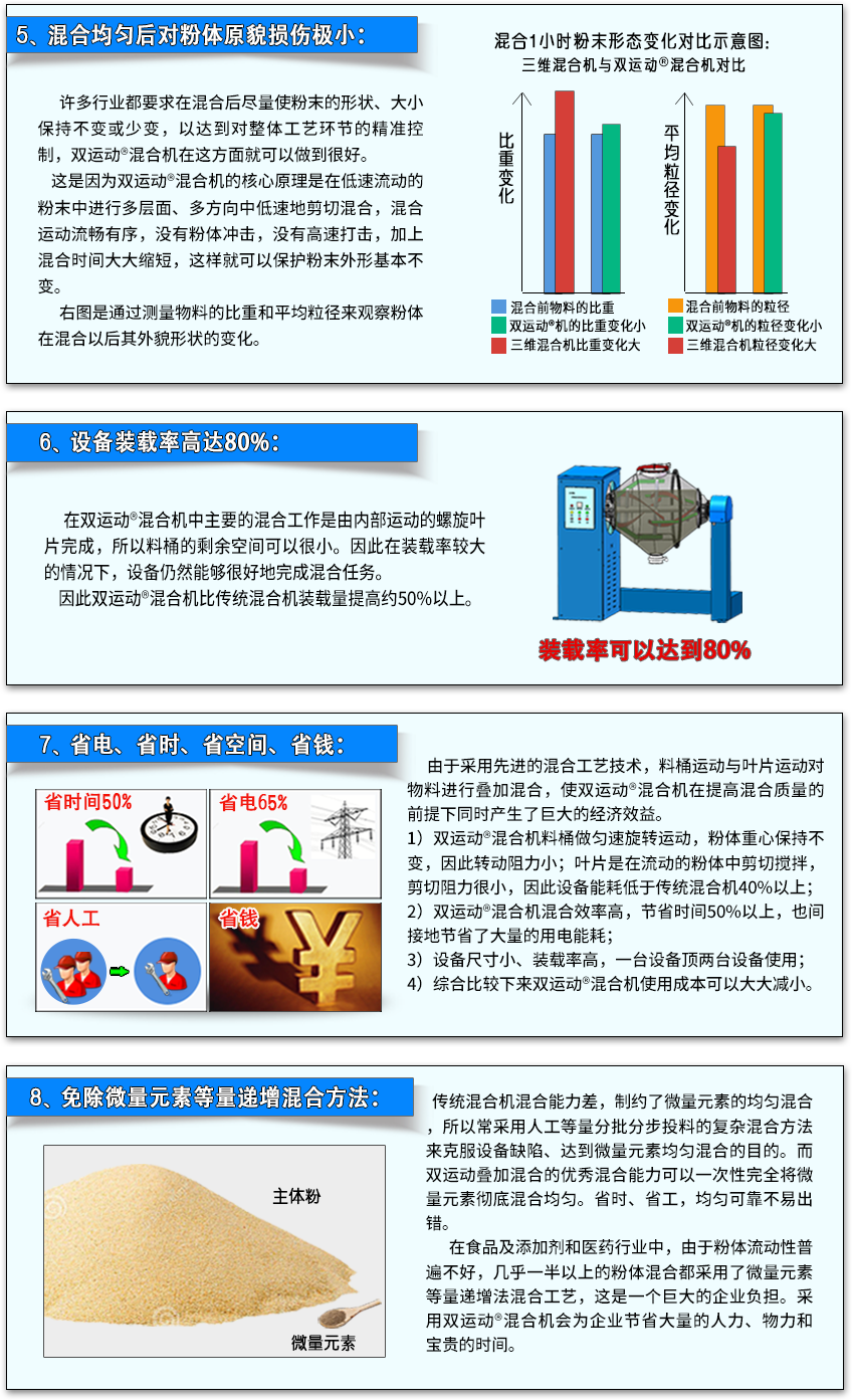 這也是因為兩個運動疊加混合的先進原理,在單位時間內(nèi)兩個運動同時進行,不但雙倍地提高混合效率,還恰到好處地互相促進混合作用,促進混合工作更加有效地進行。因此雙運動混合機比傳統(tǒng)混合機節(jié)省時間60%。