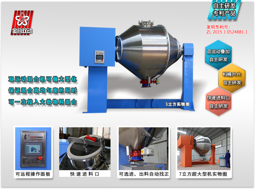 在食品添加劑及獸藥制藥等行業(yè)存在著混合批量大、同時又對混合均勻度要比較高的需求,而將混合機規(guī)格做大是比較困難的,我們研發(fā)的雙運動混合大型機很好的解決了這一問題。到目前為止我們已為客戶提供了多臺7立方米的雙運動混合大型機,并且在客戶使用過程中做到混合效果又好混合批量又大的良好效果。