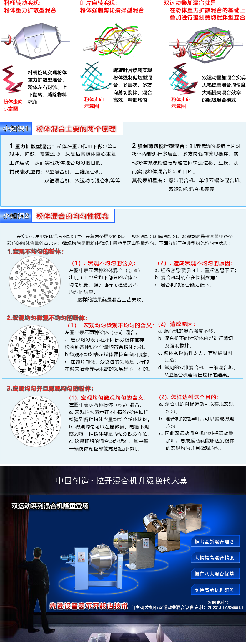 采用先進的雙運動疊加混合技術,在一臺設備上實現(xiàn)重力擴散型混合和強制剪切型混合兩大功能。既能做到宏觀大處均勻—即讓粉體上下翻滾、左右對流進行擴散均勻混合;又能對粉體微觀處顆粒與顆粒之間,反復進行多層次多方向地穿插、剪切,做到精細化強制混合。所以混合均勻度可以達到宏觀均勻和微觀超精細均勻的理想境界。